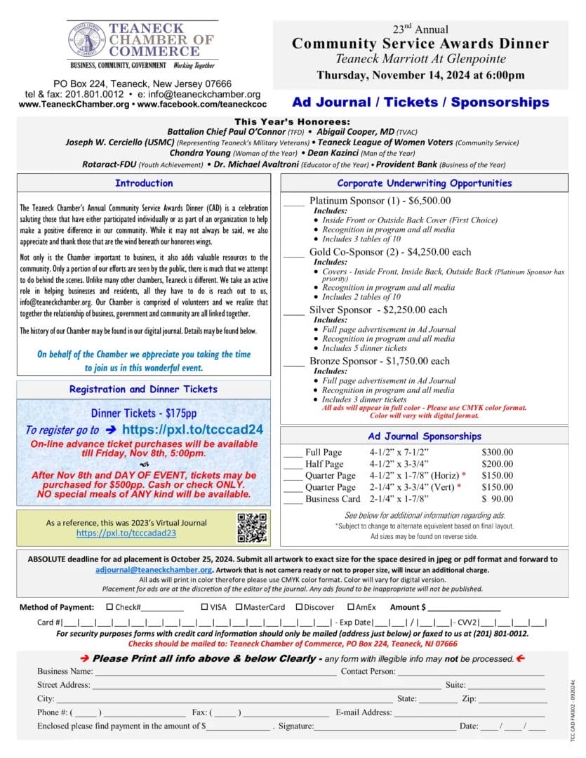 Our 23rd Annual Community Awards Dinner will be held on Thursday, November 14, 2024 at the Teaneck Marriott at Glenpointe.